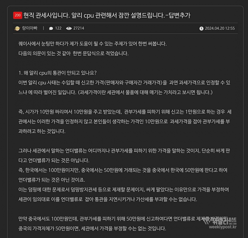 수입제품으로 취급되기에 통관 과정에서 문제가 발생할 수도 있다. 올해 4월에는 알리익스프레스를 통해 해외직구로 들어온 CPU 제품이 '언더밸류'를 이유로 세관에 대거 압류돼 조사를 받으며 통관이 크게 지연된 사례가 발생했다. 언더밸류란 일정가격 이상이면 붙는 세금을 피하기 위해 실 판매가보다 낮게 세관에 신고하는 경우를 말한다.