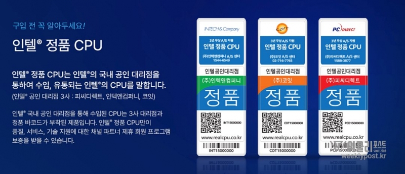 하지만 이런 절차가 귀찮다면 구입할 때 국내 정품을 판매하는 판매점, 조립PC 전문점에서 CPU를 구입하면 된다. 현재 대한민국에서 인텔 정품 CPU 유통을 맡은 회사는 피씨디렉트, 인텍앤컴퍼니, 코잇의 세 회사다. 인텔 정품 CPU는 제품 1개마다 개별 박스로 포장되어 있으며 인텔 정품 스티커가 붙어있다. 이들 스티커에는 큐알코드와 바코드가 붙어 있다.