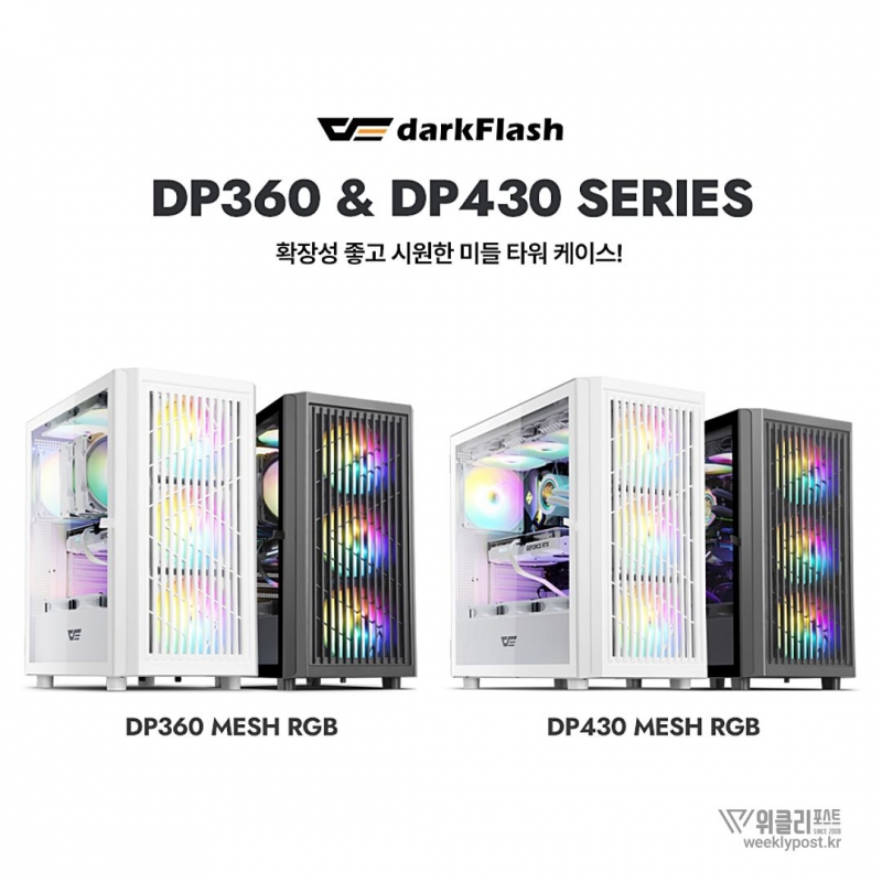 다크플래쉬의 공식 수입사 투웨이가 darkFlash DP360 MESH RGB 강화유리와 darkFlash DP430 MESH RGB 강화유리 PC 케이스 제품을 블랙과 화이트 색상으로 출시했다.