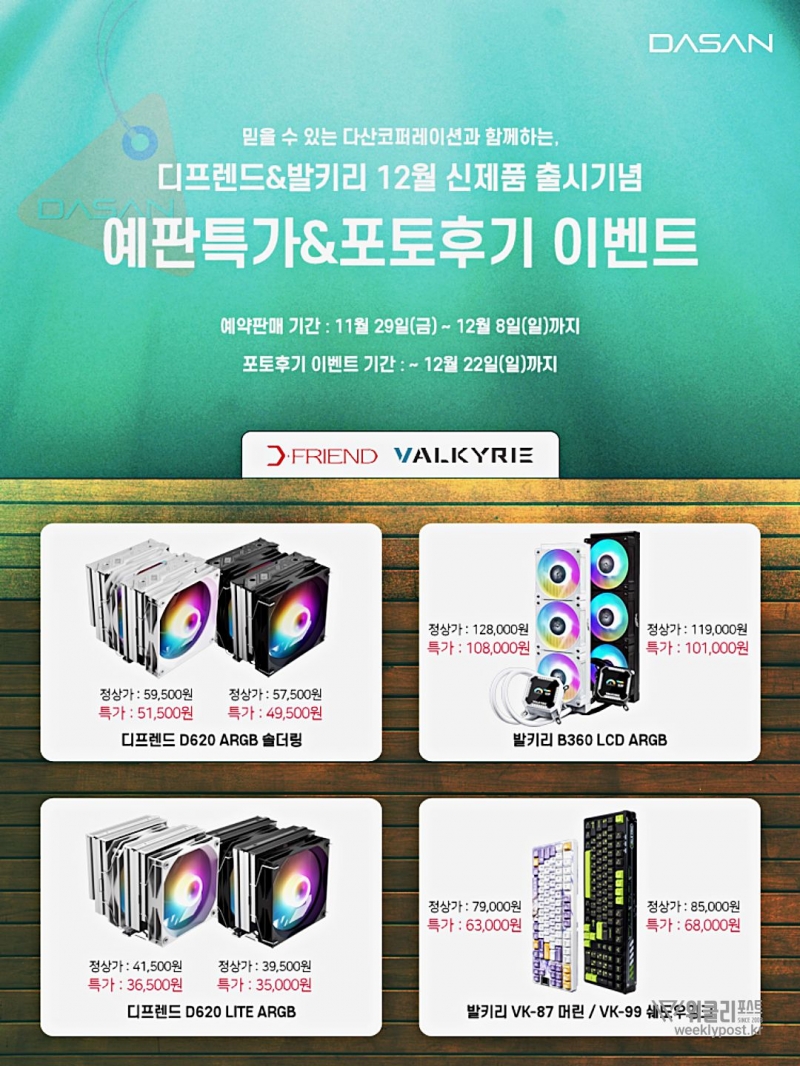 다산코퍼레이션은 발키리 B360 수랭쿨러, VK99 쉐도우잉크 한글 키보드, VK87 마린 텐키리스 키보드, 디프렌드 D620 ARGB 솔더링, D620 ARGB Lite 공랭쿨러 등 8종의 신제품을 대상으로 11월 29일부터 12월 8일까지 예약 특가 판매와 포토 후기 이벤트를 진행한다고 밝혔다.