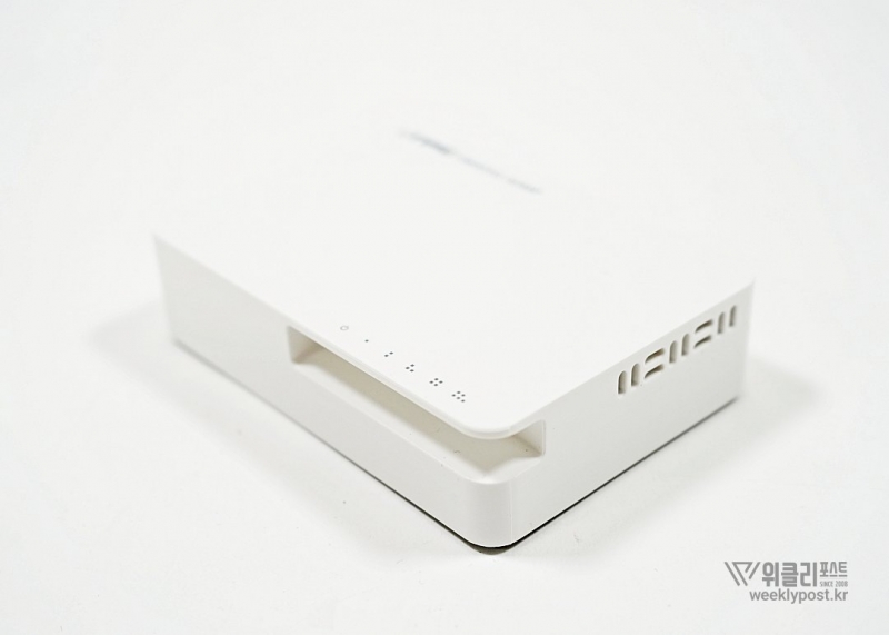 제품은 적절한 성능과 함께 기능을 간소화해 제작된 보급형 스위칭 허브다. 디자인은 직사각형 큐브 형태로, 심플한 화이트 색상이 적용되었다. 크기는 93 x 65 x 24mm로 매우 작은 편이다.