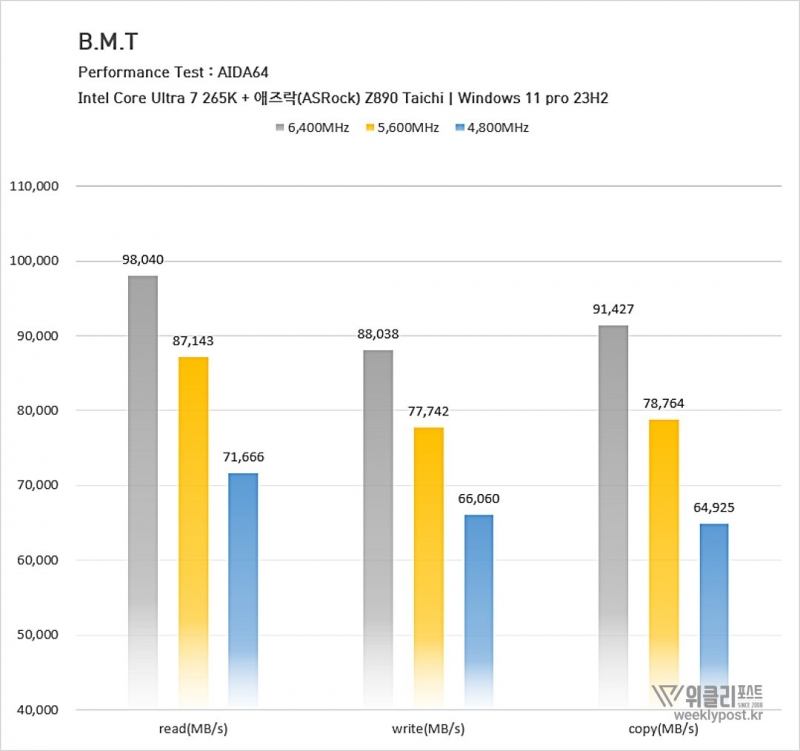 성능을 확인해보면 랜서 RGB 화이트 64GB는 기본 DDR5 5600MHz 메모리보다 확실히 높은 성능을 제공한다. 특히 읽기 성능은 동급 6400MHz 클럭 메모리와 비교해도 우수하며, 쓰기 및 복사(Copy) 성능은 유사한 수준을 유지한다. 이러한 성능 차이는 램타이밍(CL32-39-39)이 표준 메모리보다 조여져 있기 때문으로 분석된다.