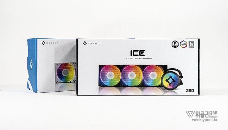 이엠텍 레드빗 ICE 360 ARGB는 슬림한 직사각형 형태의 3열 라디에이터를 갖춘 일체형 수냉 쿨러로, 라디에이터를 중심으로 3개의 쿨링팬이 배치되어 있다 . CPU와 직접 접촉하는 원형 워터블록은 튜브를 통해 연결되며, 열을 빠르게 분산시키는 효율적인 설계를 따르고 있다.