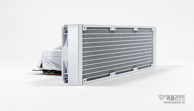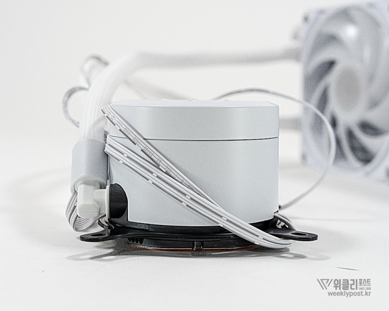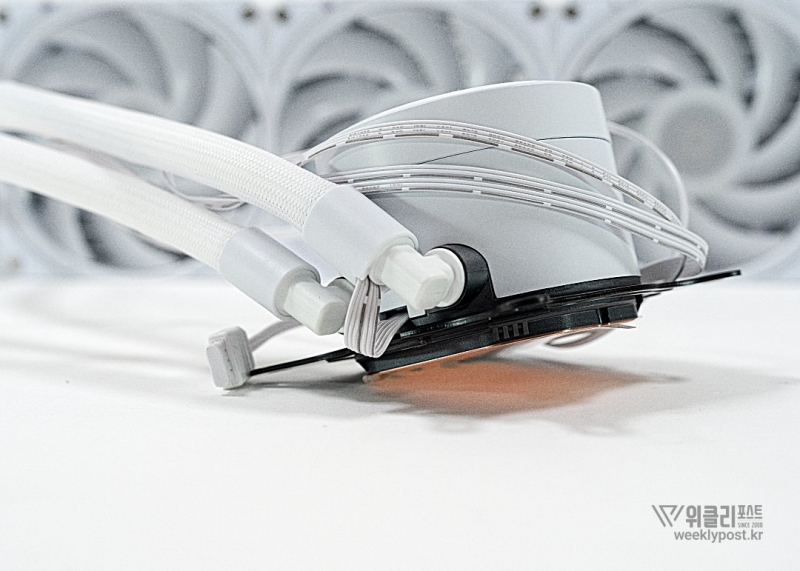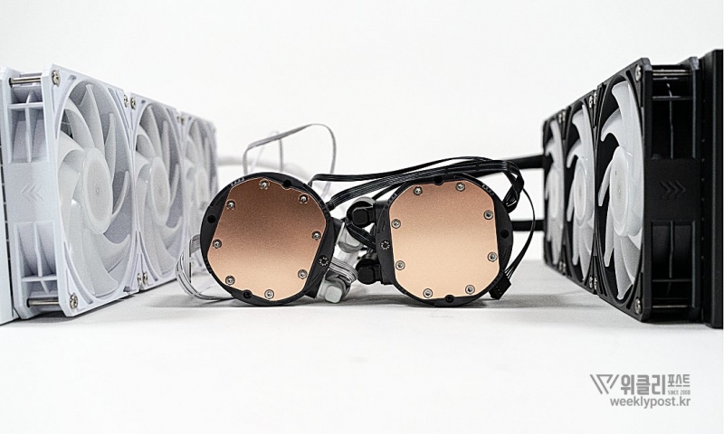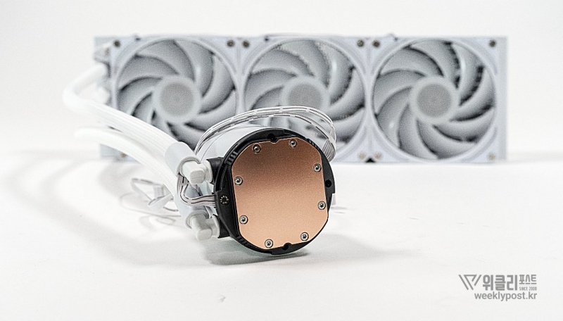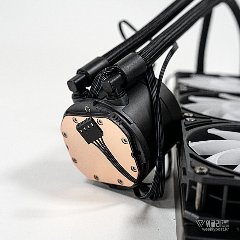 CPU와 직접 맞닿는 워터블록은 100% 구리 베이스로 제작되었으며, 이전 세대보다 면적이 더욱 넓어졌다. 고밀도 구리 핀 디자인을 적용해 냉각수 접촉 면적을 확대했으며, 마이크로 채널 플레이트 설계로 발열을 빠르게 분산시켜 냉각 성능을 극대화했다.