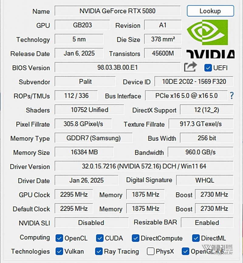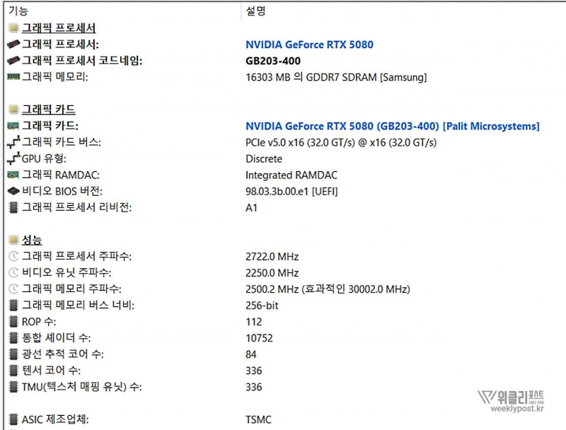 칩셋: NVIDIA GeForce RTX 5080 (TSMC 4nm 공정, 쿠다 프로세서 10,752개)