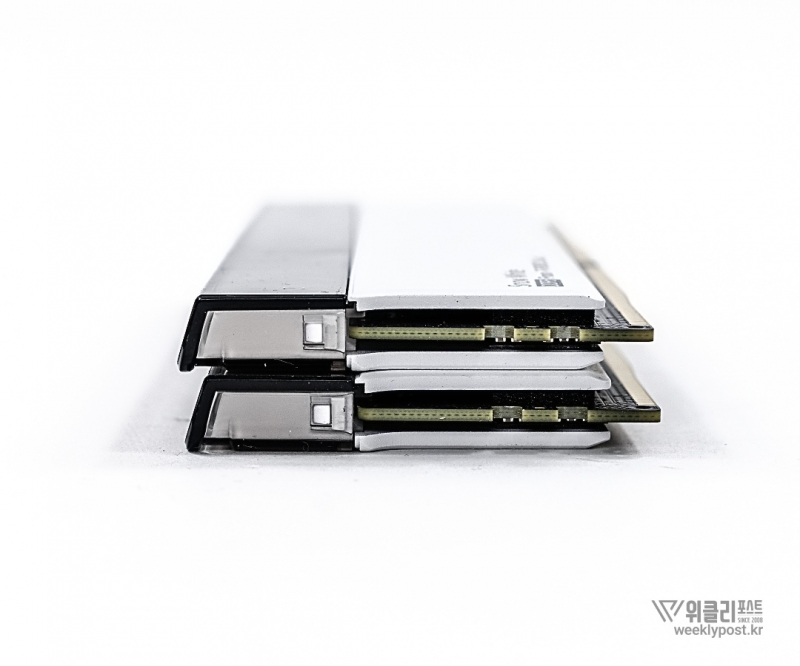 여기에 알루미늄 압출 및 CNC 정밀 가공을 거친 후, 샌드블라스트 표면 처리를 적용했다. 메모리를 직접 만져보면 손끝에서 느껴지는 감촉이 상당히 고급스럽다. 히트싱크의 역할도 크다. 히트스프레더가 없는 경우와 비교하면 냉각 성능에서 약 10% 차이가 난다.