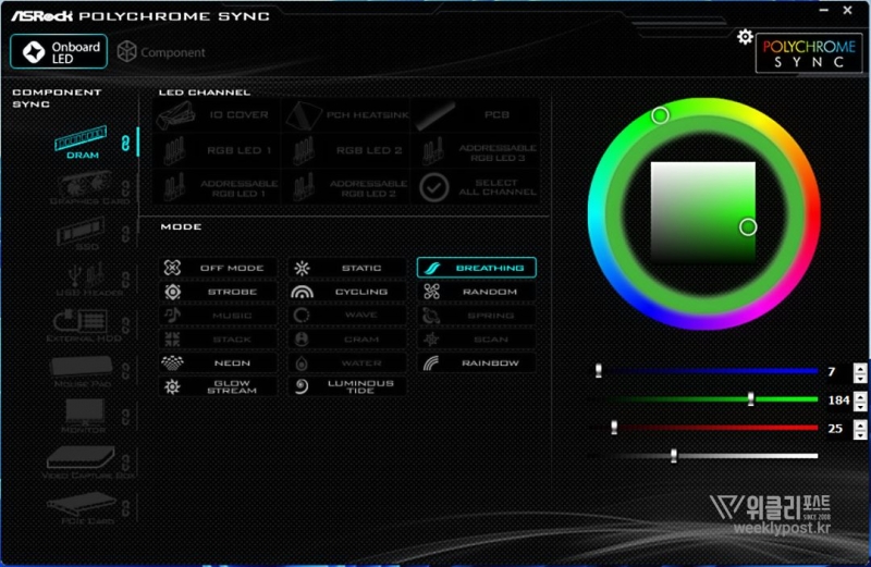 ARGB 조명은 메인보드의 동기화 소프트웨어를 통해 제어할 수 있다. ASRock 메인보드가 제공하는 Polychrome Sync를 시작으로 Aura Sync, RGB Fusion 2.0, Mystic Light Sync, RGB Sync 등의 소프트웨어를 지원한다.
