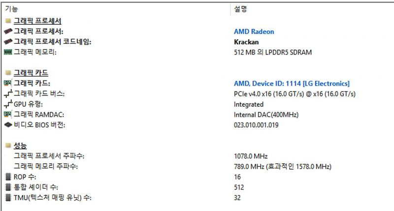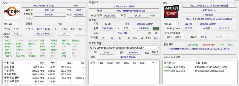 LG 그램 15Z80T는 휴대성과 성능을 균형 있게 갖춘 15인치 초경량 노트북이다. 중심에는 4P+4E 구조의 AMD 라이젠 AI 7 350 프로세서가 있다. 8코어 16스레드 구성으로, 순간적인 연산 속도가 필요한 작업은 P코어가, 전력 효율이 중요한 가벼운 작업은 E코어가 맡는다. 여기에 최대 50TOPS 성능의 NPU가 더해져 문서 요약, 실시간 번역, 영상 보정 같은 AI 기반 기능을 하드웨어 차원에서 가속할 수 있다. 다만 AI 활용 환경이 아직은 완전히 자리 잡지 않았기 때문에, 잠재력은 앞으로 더 빛을 발할 가능성이 크다.