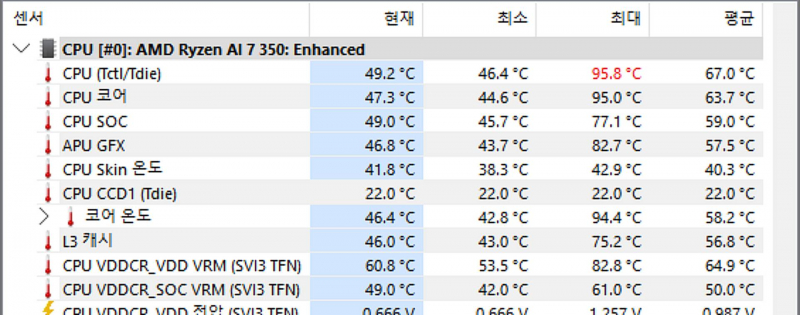 ▲ 부하를 최대로 건 상태에서 95.8도 까지 온도가 상승했다. 제법 높은 온도임에도 손목에 전해지는 온도는 미비했다.
