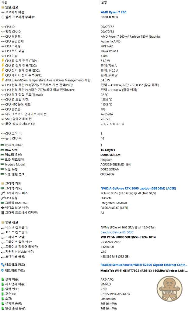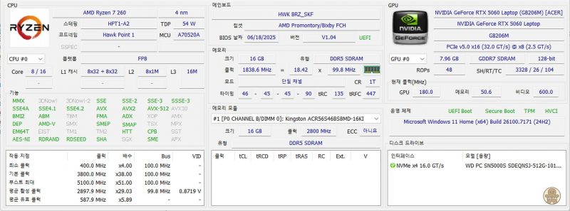 CPU : AMD 라이젠 7 260 (Zen4, Hawk Point) / 8코어 16스레드 / 최대 5.1GHz