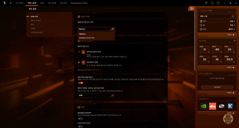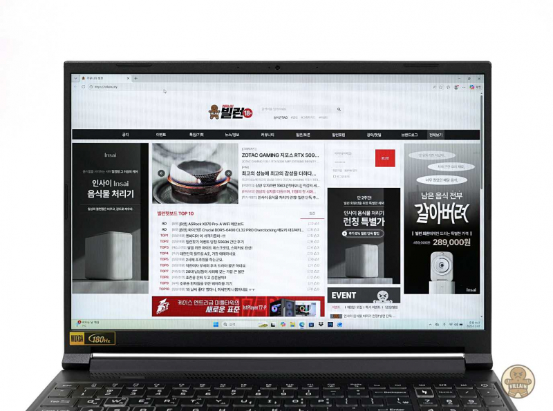 노트북의 화룡정점은 매번 디스플레이가 맡는다. 16인치에 16:10 비율 WUXGA 해상도, 180Hz 주사율, sRGB 100%라는 스펙의 제품. 굳이 해상도를 QHD 이상으로 올리는 대신 WUXGA에 머문 이유인 즉슨 GPU가 소화 가능한 프레임을 고스란히 살리기 위한 현실적인 절충이자 전략이다. 그 이상의 해상도라면 GPU도 더 상급이 들어가야 한다. 가용 예산에 영향을 줄 정도로 민감한 문제 앞에서 에이서의 절충은 약 200만 원 미만이다. 그러면 지금까지 설명한 구성이 합당하다.