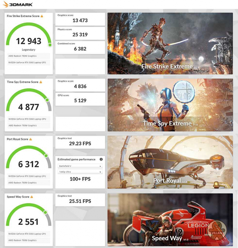 Time Spy Extreme은 DX12 기반의 복합 그래픽 부하를 전제로 GPU와 CPU가 동시에 처리해야 하는 연산 흐름을 평가하는 테스트로 장면 구성 과정에서 프레임 생성이 밀리거나, 화면 요소가 지연되는 현상이 얼마나 많고 적음을 따진다. 이는 4K 혹은 고비트레이트 영상 편집에서 타임라인 이동 시 프리뷰가 즉각 갱신되거나, 3D 모델 뷰에서 고폴리곤 오브젝트를 회전·확대할 때 반응이 끊기지 않는 결과와 같이 시각적 요소가 많은 작업에서 사용자가 기다리는 시간이 얼마나 단축될 지를 의미한다. 측정된 4,877점은 RTX 5060(70W 구성)의 상위권 출력에 해당한다. 실제 사용에서는 4K 영상 편집에서 타임라인을 빠르게 이동해도 미리보기가 지연 없이 갱신되고, 3D 모델을 회전하거나 확대할 때 작업이 자연스럽다.
