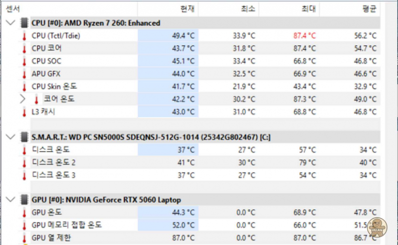 온도를 보면 먼저 CPU. 라이젠 7 260 패키지 온도는 풀로드에서 최대 87.4℃, 평균은 56℃ 안팎으로 측정됐다. 코어 온도도 비슷한 수치다. AMD가 스로틀을 걸기 시작하는 지점이 90℃대인 걸 감안하면, 벤치마크·게임을 오래 돌렸을 때도 클럭을 강제로 내릴 정도까지는 올라가지 않았다는 뜻이다. 센서에 잡힌 ‘CPU Skin 온도’ 최대값이 43.4℃라서, 상판 표면은 손으로 만졌을 때 뜨겁다고 느낄 정도까지는 올라가지 않았다. 키보드 상단만 미지근해지고 팜레스트 쪽의 온도는 미비했다.