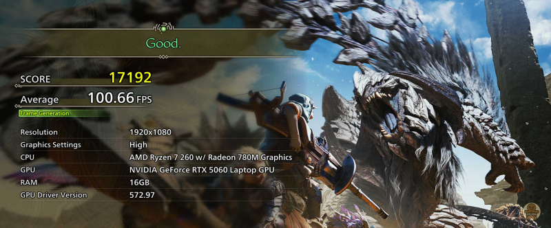 마지막으로 High 프리셋에 DLSS와 프레임 생성(Frame Generation)을 모두 활성화한 상태에서는 평균 100.66FPS를 기록했다. 첫 번째 결과와 비교하면 프레임이 40가량 추가로 확보된 셈이다. 시선 전환이 빠르게 이뤄지는 게임, 빠른 입력이 중요하다면 두 가지 옵션 활성화는 필요하다. 내장 RTX 5060에서 DLSS를 활성화 했을 때 어느 정도까지 성능 향상이 이뤄지냐를 명확히 안내하고 있다.
