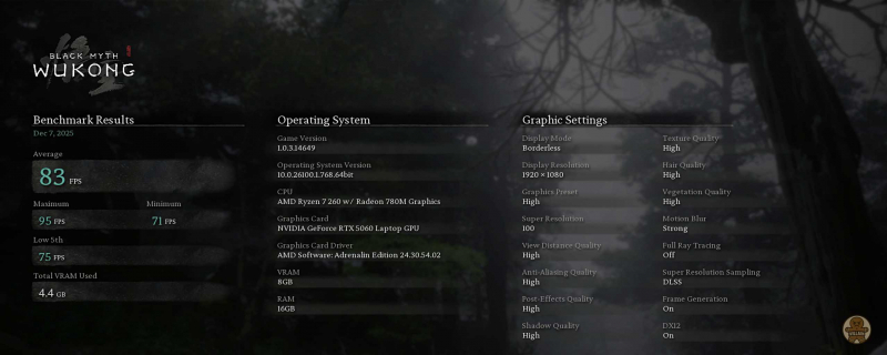 블랙 마스: 오공 벤치마크는 1920×1080 해상도, 그래픽 프리셋 ‘High’, DLSS와 프레임 생성 기능을 모두 활성화했을 때 평균 83FPS, 최소 71FPS, 하위 5%가 75FPS로 잡혔다. 한 번 캐시가 잡힌 뒤에는 70~80FPS 대로 안정적으로 굳어지는 모습이다. 이 정도면 공격 모션이 이어지는 보스전에서도 부드럽게 전개된다. 물론 니트로 V 16S AI의 180Hz 패널 성능을 100%발휘하긴 힘들지만, 고주사율이 주는 이득을 체험하기에는 충분한 범위다.
