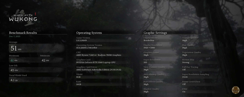 마지막으로 프레임 생성만 끄고 DLSS도 최소로 했을 경우 평균 51FPS가 측정됐다. 최대 61FPS, 최소 42FPS로, 숫자만 놓고 보면 콘솔에 가까운 움직임이다. 옵션과 프레임 생성만 꺼도 바로 50FPS대로 내려앉는 만큼, 게임을 FHD·High 그래픽으로 즐길 생각이라면 DLSS와 프레임 생성을 함께 쓰는 편이 훨씬 합리적이다.