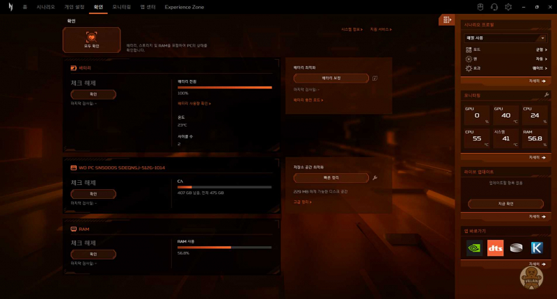 스토리지 최대 온도는 79℃(평균 40℃ 전후)다. 3DMark·게임 로딩을 반복하는 상황에서 한 번 치고 올라간 값으로 보이지만, NVMe SSD의 허용 범위 안이다. 다만 장시간 대용량 복사나 연속 인코딩을 많이 다루는 사용자라면, 하판 통풍구를 막지 않는 정도의 관리만 해 주면 좋겠다.