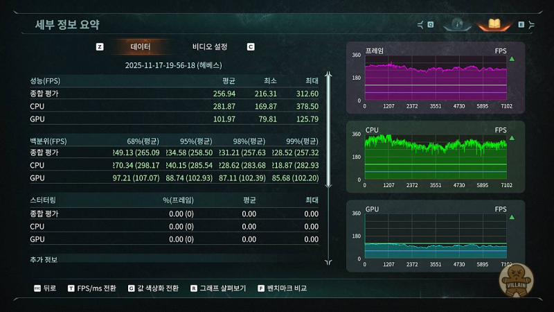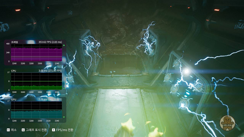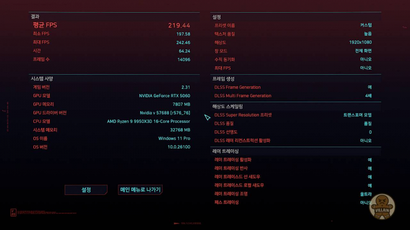 | RTX 5060 | DLSS 품질 + FG 4× | 256.94 | 216.31 | 312.6 | 프레임 생성 기능 활용 시 240Hz 주사율로도 즐길 수 있음 |
