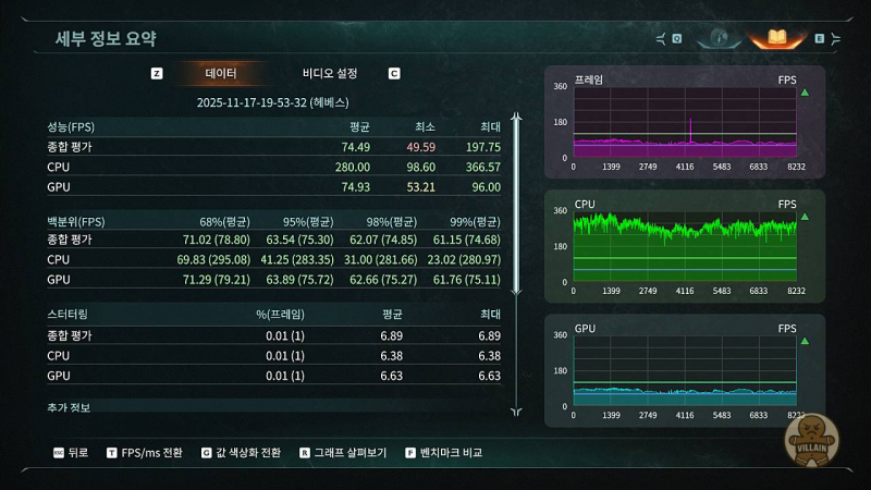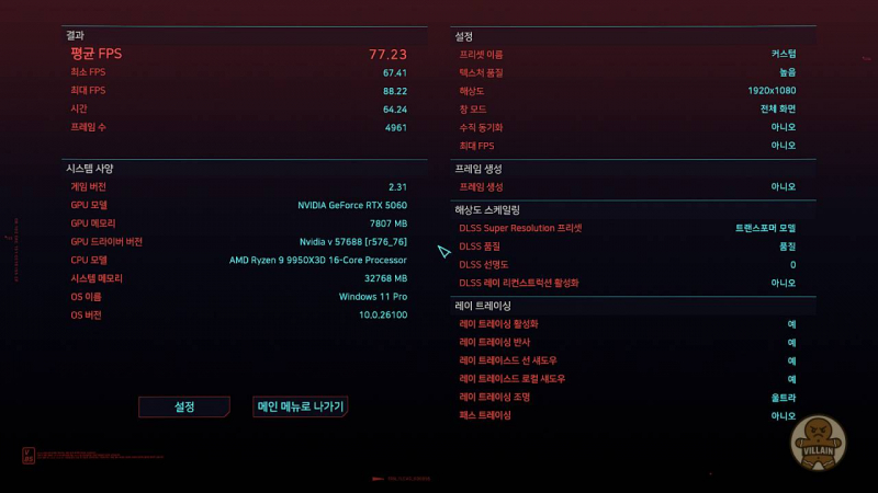 | RTX 5060 | TAA (DLSS 미적용) | 74.49 | 49.59 | 197.75 | DLSS 미적용 시 FHD 75 프레임 정도로 유지 |