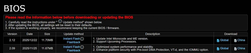 한편 인텔 플랫폼에서도 변화가 있다. ASRock은 일부 800시리즈 인텔 메인보드에 대해서도 신규 BIOS를 배포했다. 이번 BIOS는 최신 인텔 마이크로코드와 ME 펌웨어를 포함하며, ‘출시 예정 인텔 CPU 지원’이 명시돼 있다.