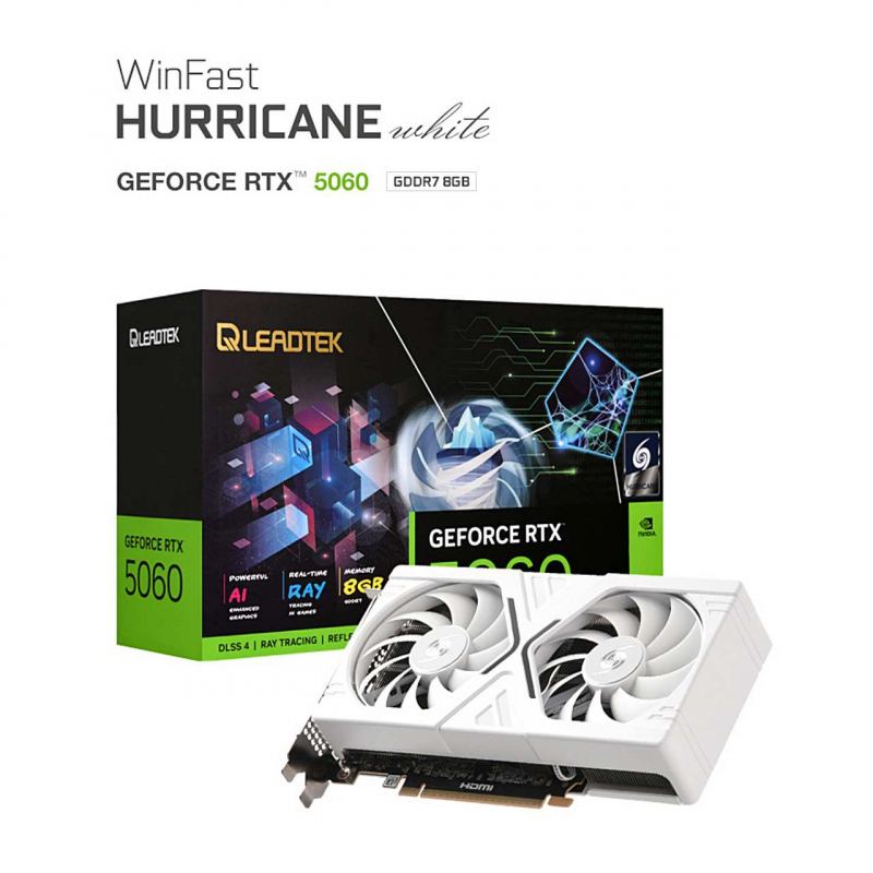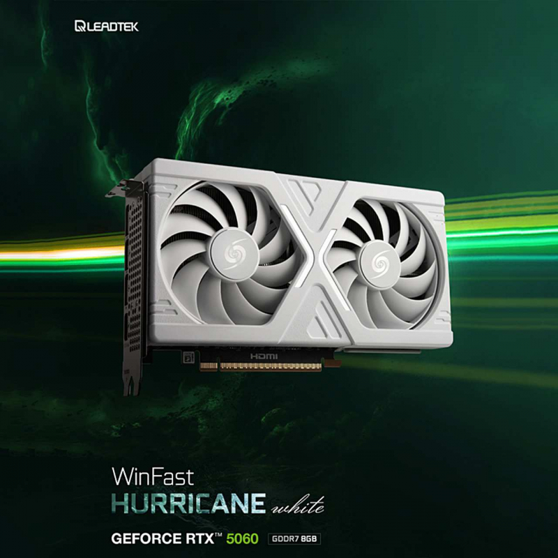 서린씨앤아이는 리드텍 WinFast 지포스 RTX 5060 HURRICANE D7 8GB 화이트 그래픽카드를 출시했다. RTX 5060 GPU와 GDDR7 8GB 메모리를 기반으로 PCIe 5.0 환경에 맞춘 구성이며, 듀얼 90mm 팬과 6mm 히트파이프 2개를 사용하는 허리케인 쿨링 설계를 적용했다. 보증 기간은 3년이다.