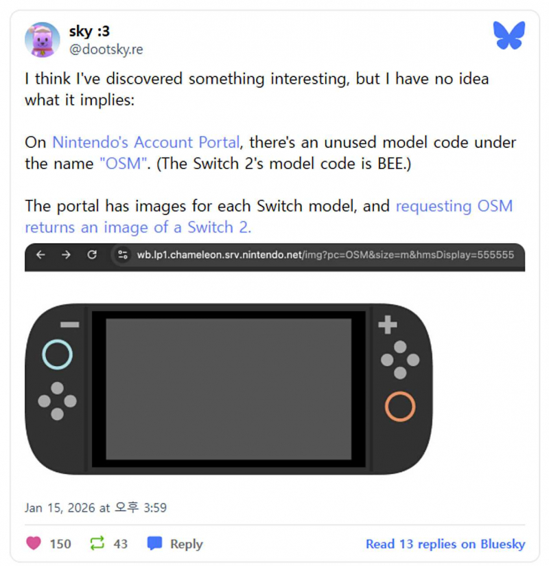 블루스카이 이용자 dootsky.re에 따르면, Nintendo의 계정 관리 포털(Account Portal) 내부에서 사용되지 않는 모델 코드 하나가 확인됐다. 코드명은 OSM이며, 현재 판매 중인 닌텐도 스위치 2의 모델 코드인 BEE와는 별도로 존재한다.