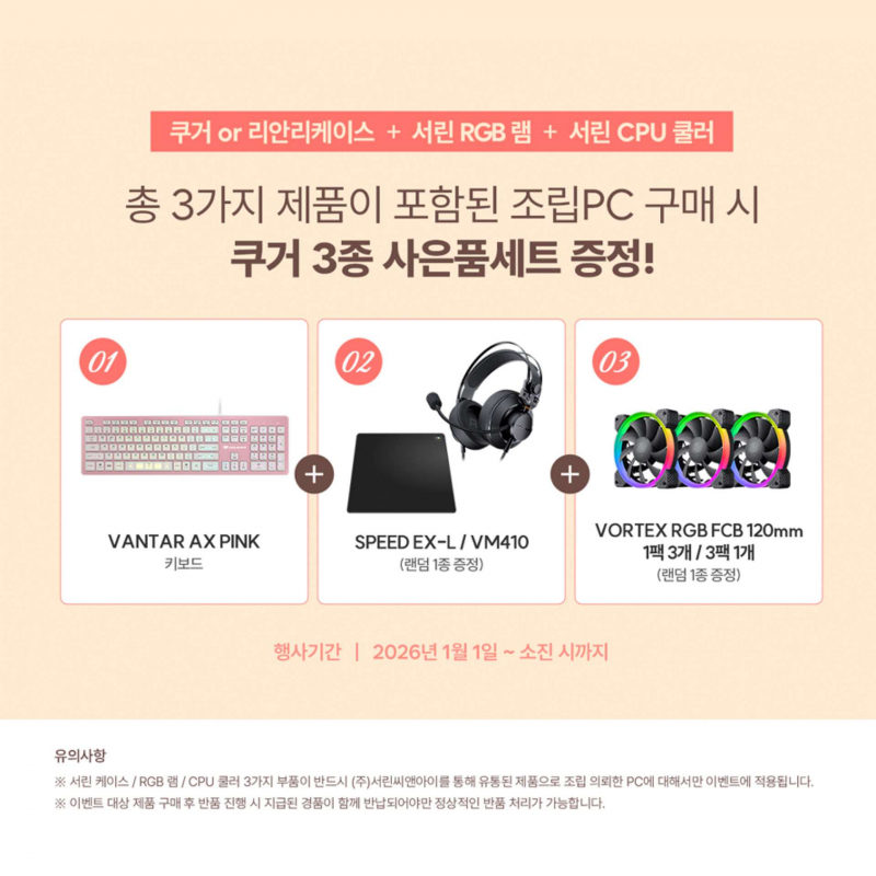 프로모션 기간은 1월 1일부터 사은품 재고 소진 시까지다. 재고 소진 시 별도 안내 없이 종료될 수 있다. 적용 대상은 서린씨앤아이 유통 제품으로 조립한 PC로 한정된다. 반품 시에는 제공된 사은품을 함께 반납해야 한다.