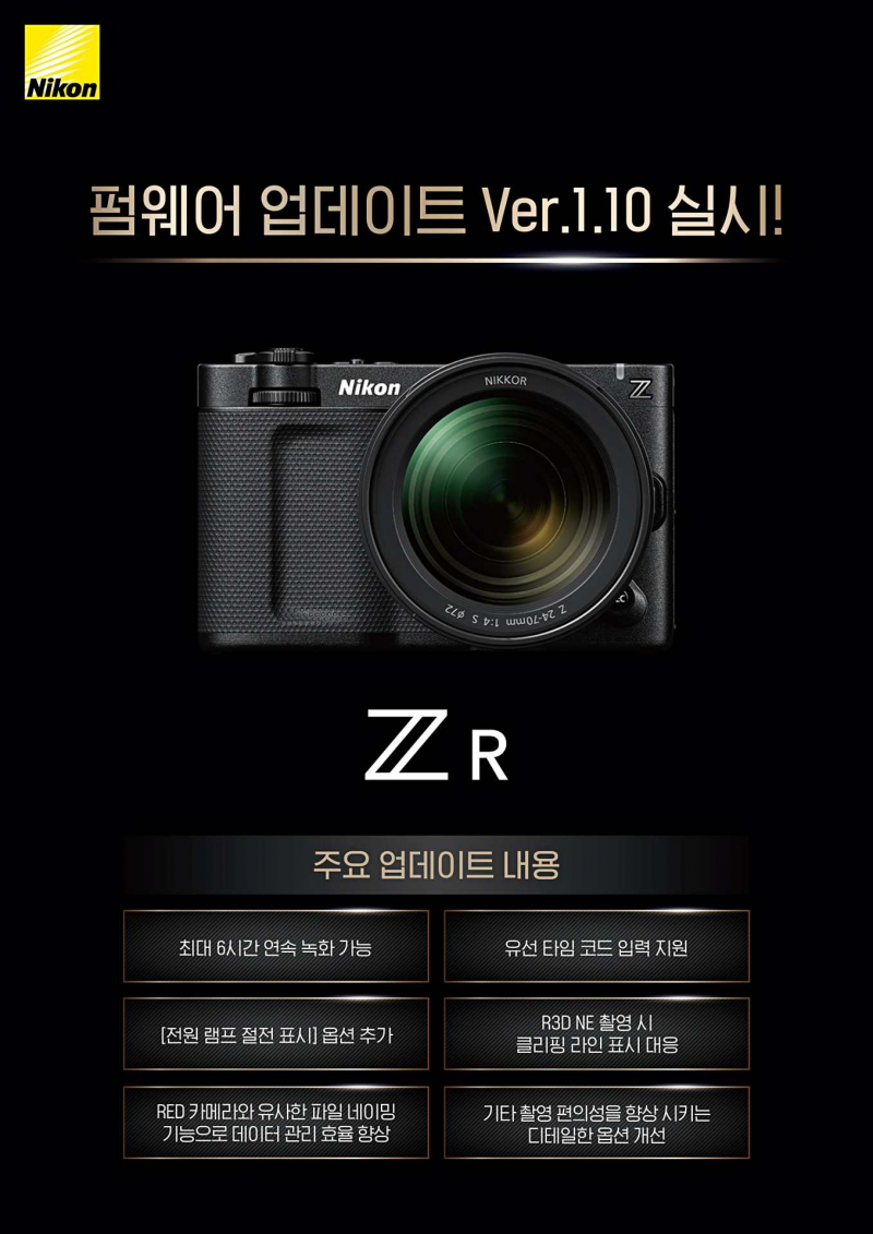니콘이미징코리아는 RED Digital Cinema와 공동 개발한 풀프레임 시네마 카메라 ZR의 펌웨어 1.10을 공개했다. ZR 출시 이후 첫 업데이트이며, 연속 녹화 시간 확대와 장비 동기화, 노출 제어, 데이터 관리 기능을 강화했다.