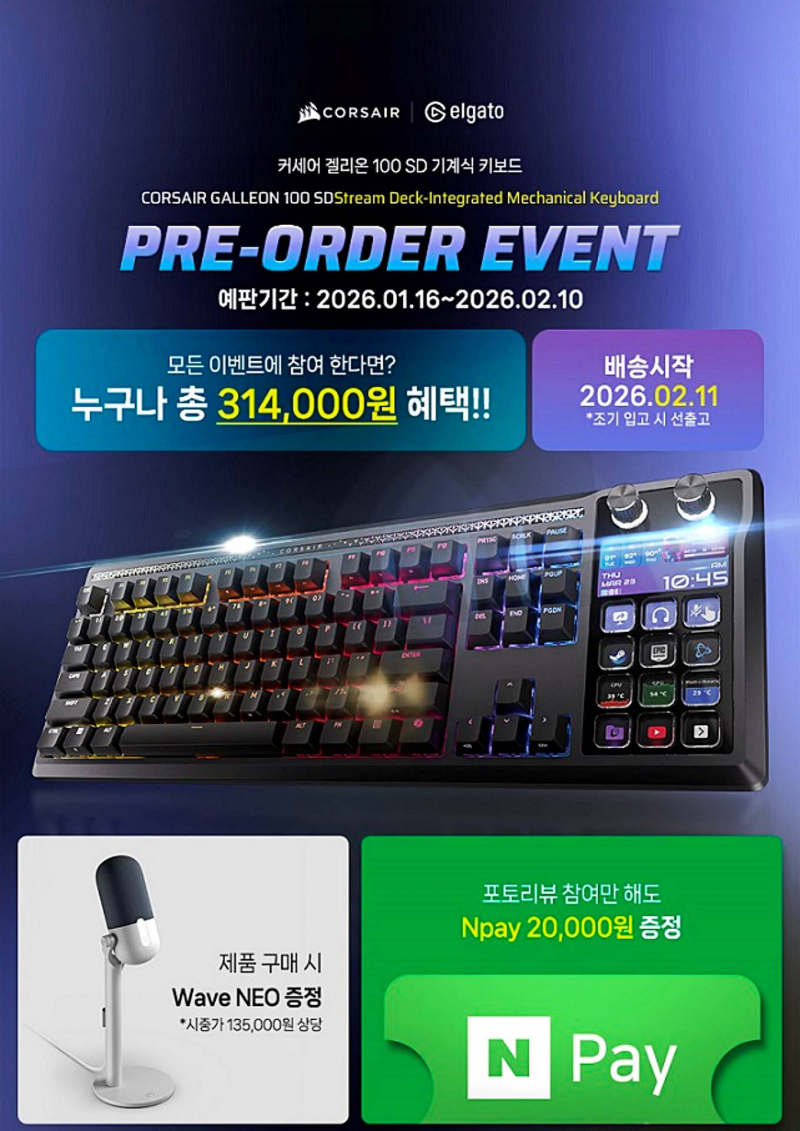 커세어는 갤리온 100 SD 출시 기념 예약판매 이벤트를 1월 16일부터 2월 10일까지 진행한다. 사전 구매 고객에게 엘가토 웨이브 네오 마이크를 제공하며, 포토 리뷰 참여 고객에게 네이버페이 2만 원을 추가 제공한다. 퀘이사존, 쿨엔조이, 조드에 리뷰를 게시하고 QR 인증을 완료한 고객에게 VOID v2 헤드셋을 제공한다. 제품은 2월 11일부터 순차 발송되며 조기 입고 시 선출고될 수 있다.