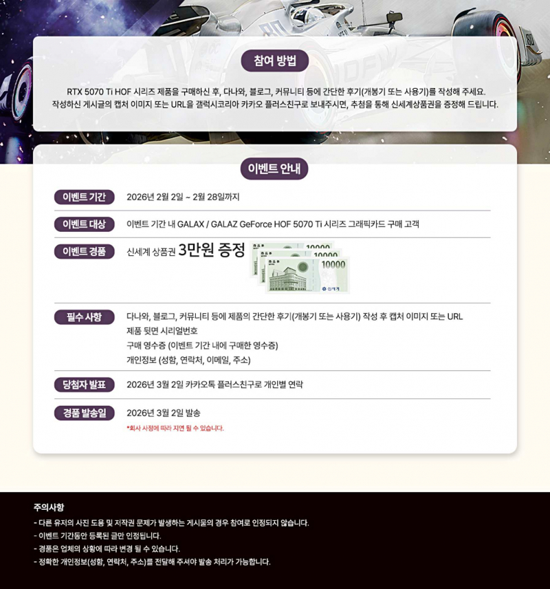 갤럭시코리아는 2월 한 달간 GeForce RTX 5070 Ti HOF 시리즈 구매 고객을 대상으로 후기 이벤트를 진행한다. 제품 개봉기 또는 사용기를 다나와·블로그·커뮤니티에 올린 뒤, 게시글 URL 또는 캡처 이미지와 영수증, 제품 시리얼 번호, 개인정보를 카카오톡 플러스친구 채널로 제출하면 응모된다. 추첨으로 신세계 상품권을 증정한다.