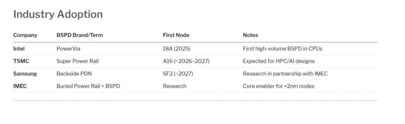 핵심 이유로 지목되는 것은 인텔이 18A와 14A 노드에서 전면적으로 채택한 BSPD(Backside Power Delivery, 후면 전력 공급) 전략이다. 인텔은 자사의 PowerVia 기술을 통해 최신 공정에서 BSPD를 기본 구조로 채택했지만, 이 선택이 모바일 SoC에는 치명적인 한계로 작용할 수 있다는 지적이다.