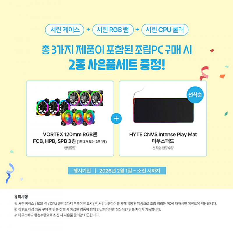프로모션 대상은 서린 케이스, 서린 RGB 램, 서린 CPU 쿨러 3가지 부품이 포함된 조립PC다. 행사 기간은 2026년 2월 1일부터 사은품 소진 시까지다.