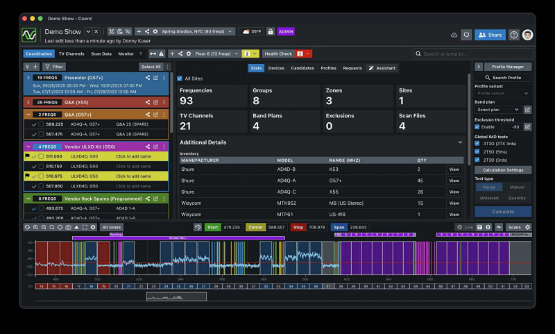 젠하이저는 사운드베이스와의 협업을 통해 제조사와 관계없이 다양한 무선 시스템을 단일 인터페이스에서 통합 관리하는 방식을 소개했다. 사운드베이스는 RF 코디네이션과 주파수 관리를 하나의 운영 환경에서 다루도록 설계됐으며, 소규모 이벤트부터 방송, 투어 환경까지 적용 범위를 확장하는 방향을 제시했다. 사운드베이스는 무료 버전 SE와 고급 기능을 제공하는 프로 버전으로 운영되며, 여러 제조사 시스템이 혼용되는 현장에서 운영 절차를 단순화하는 용도로 안내됐다.