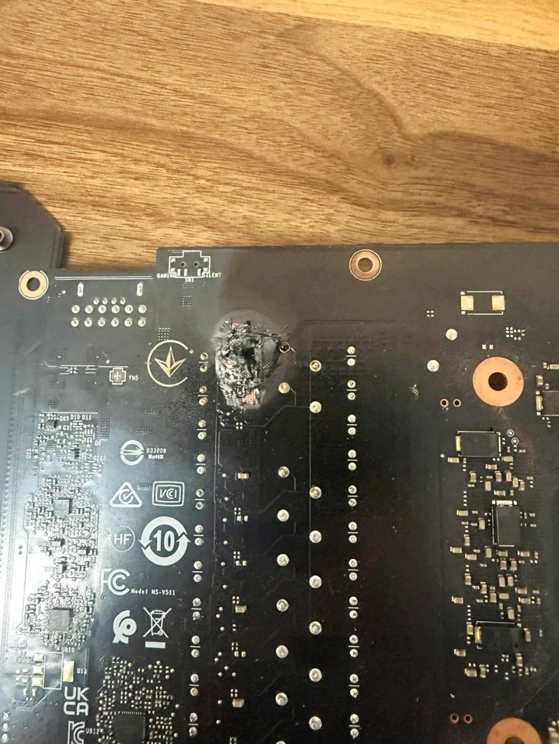 지포스 RTX 40 시리즈에서 보기 드문 수준의 심각한 손상 사례가 나왔다. 레딧 TwistedCollossus는 MSI 지포스 RTX 4080 슈퍼가 쇼트로 사망했고, 손상 강도가 너무 커 PCB에 실제로 구멍이 뚫렸다고 주장했다.