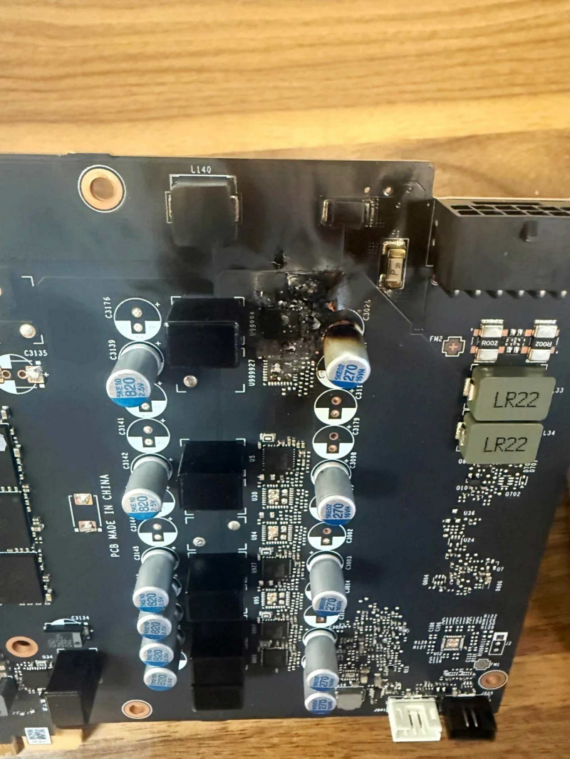 올라온 사진에서는 16핀 전원 커넥터 주변, 특히 히트싱크 아래쪽 PCB 구역이 심하게 그을려 있고, VRM 구역으로 보이는 부위에 탄 흔적과 함께 구멍이 확인된다. 측면 사진만 보면 커패시터 폭발처럼 보이지만, PCB를 직접 찍은 사진에서는 ‘커패시터 한 개가 터진 정도’로 설명하기 어려운 수준의 손상이 확인된다는 주장이다.