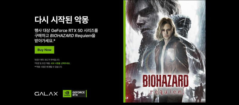 그래픽카드 전문 제조기업 갤럭시 마이크로시스템즈의 한국 지사 갤럭시코리아가 지포스 RTX 50 시리즈 구매 고객 대상 바이오하자드 레퀴엠 번들 증정 프로모션을 진행한다. 기간은 2026년 2월 10일부터 3월 16일까지다.