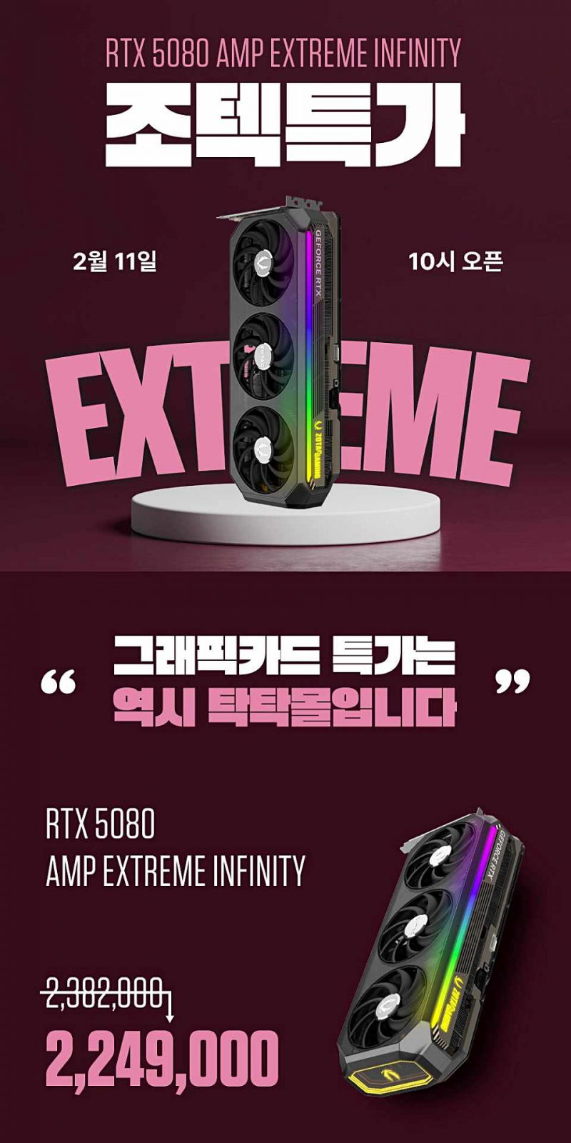 ZOTAC Korea runs a Lunar New Year special price event for ZOTAC GAMING GeForce RTX 5080 AMP Extreme Infinity. The deal opens on February 11 at 10:00 on the official TAGTAG Mall and runs until limited stock is sold out.