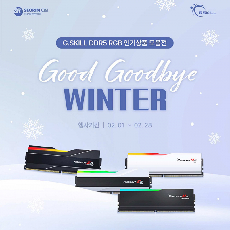 컴퓨터 부품 수입·유통 전문 업체 서린씨앤아이가 IT 전문 쇼핑몰 컴퓨존과 함께 G.SKILL DDR5 RGB 메모리 인기상품 모음전을 진행한다. 행사명은 Good Goodbye WINTER이며 기간은 2025년 2월 1일부터 2월 28일까지다.