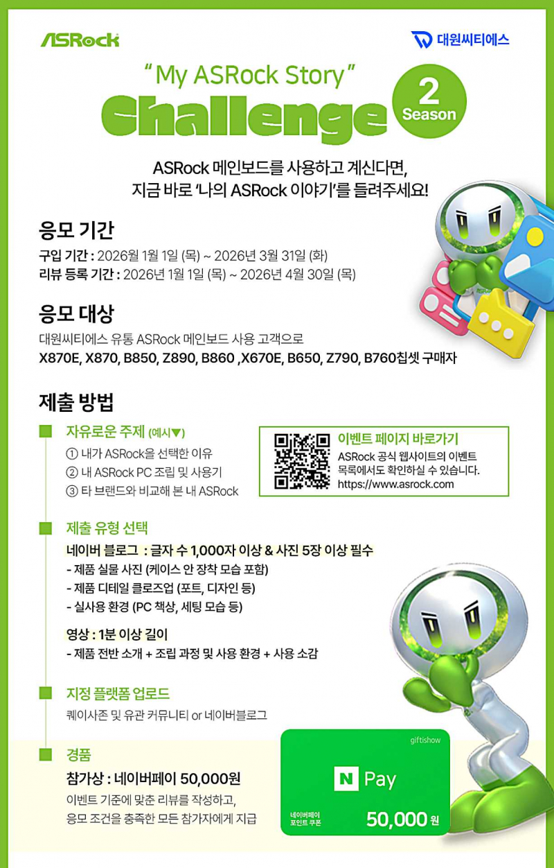DAEWON CTS is running My ASRock Story Challenge Season 2 for customers who purchased eligible ASRock motherboards between Jan 1 and Mar 31, 2026. Participants submit a blog review or a video review that meets the required format, and receive KRW 50,000 in Naver Pay points. Reviews can be submitted until Apr 30, 2026 via the event page link.