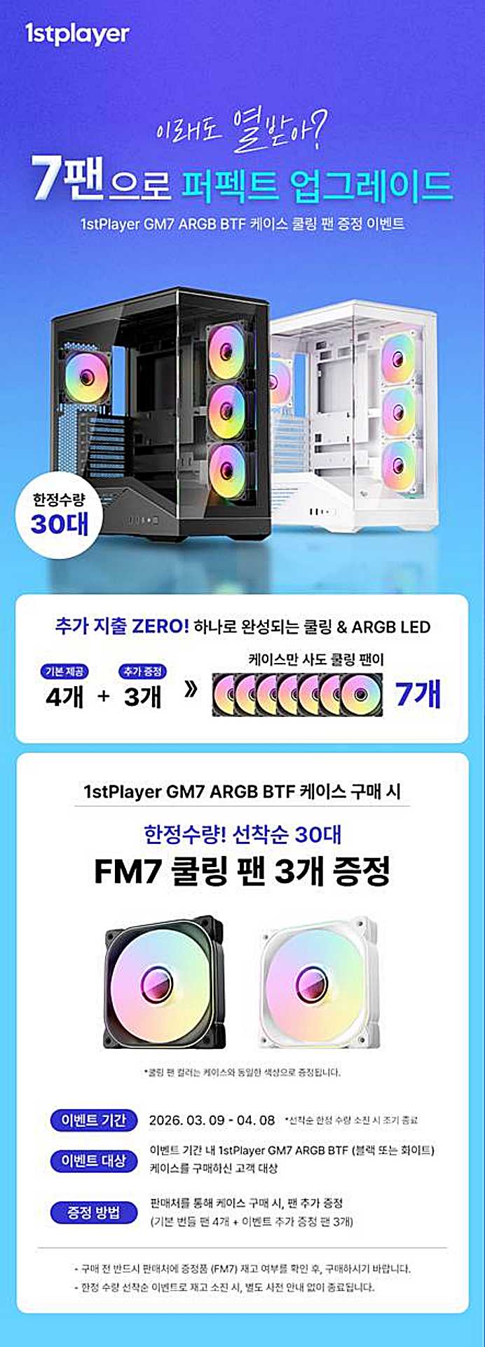 맥스엘리트가 1stPlayer GM7 ARGB BTF 케이스 구매 고객 대상 팬 증정 이벤트를 진행한다. 행사 기간 내 제품을 구매하면 기본 장착된 120mm ARGB 팬 4개와 동일한 FM7 120mm ARGB 팬 3개를 추가로 제공한다. 이벤트는 4월 8일까지 한정 수량 선착순으로 운영된다.