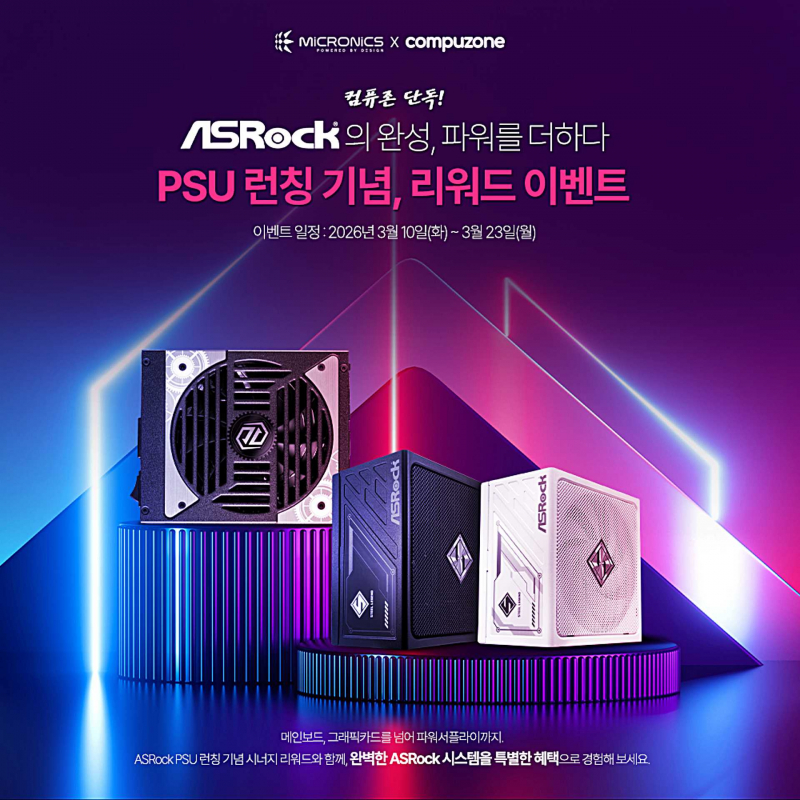 마이크로닉스는 ASRock PSU 출시를 기념해 컴퓨존에서 3월 9일부터 3월 22일까지 런칭 리워드 이벤트를 진행한다. 행사 기간 중 ASRock 파워서플라이 구매 고객에게는 최대 3만 원 상당의 컴퓨존 적립금을 제공한다. 타이치 TC-1650T 구매 시 3만 원, 스틸레전드 SL-1200G와 SL-1200GW 구매 시 2만 원, SL-1000G·SL-1000GW·SL-850G·SL-850GW 구매 시 1만 원 적립 혜택이 제공된다.