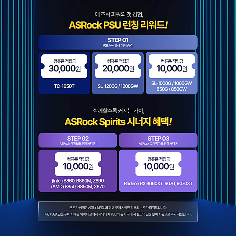 ASRock 메인보드 또는 그래픽카드를 함께 구매한 고객을 위한 시너지 이벤트도 진행한다. 메인보드는 인텔 B860·B860M·Z890, AMD B850·B850M·X870 모델이 대상이며, 그래픽카드는 라데온 RX 9060XT·9070·9070XT가 해당된다. 동시 구매 시 추가 1만 원 적립 혜택을 제공한다.