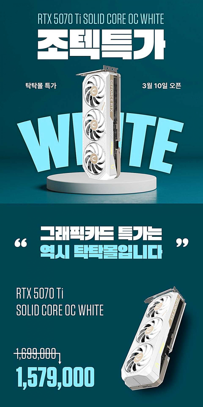 ZOTAC Korea is running a limited-time promotion for the ZOTAC GAMING GeForce RTX 5070 Ti Solid Core OC White, offering the graphics card at 1,579,000 won through its official TagTag Mall store while supplies last.