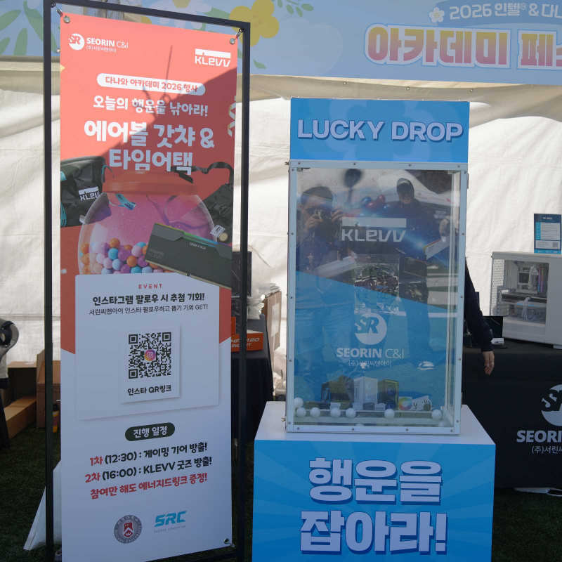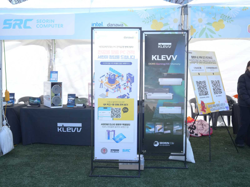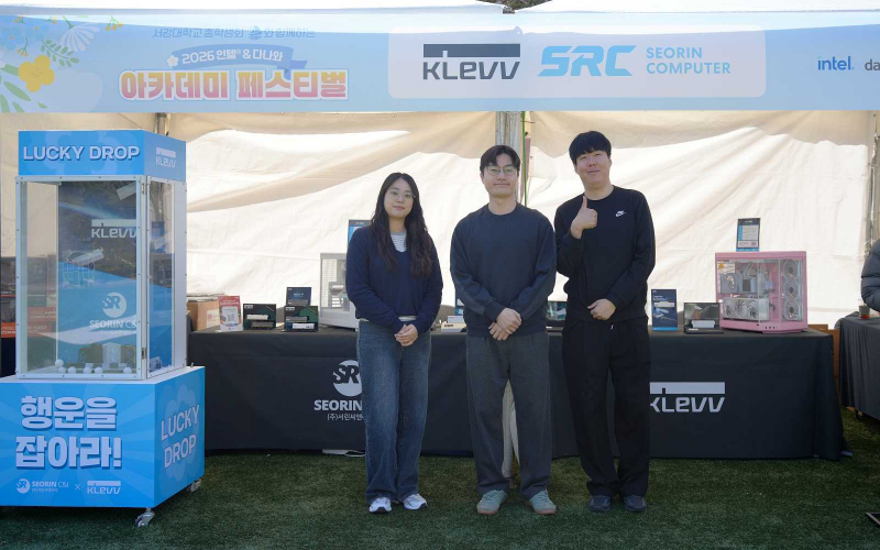 숭실대학교 캠퍼스 내 잔디광장에 펼쳐진 다나와 아카데미 2026 현장은 올해도 여러 브랜드의 개성과 전략으로 무게감이 남달랐다. 노트북과 그래픽카드, 주변기기와 완제품 PC까지 다양한 브랜드가 학생의 이목을 끌기 위해 각축전을 펼치는 가운데, 조금 다른 결의 부스가 활동이 돌입했다. 바로 메모리 브랜드 클레브(KLEVV)와 완제품 PC 브랜드 서린컴퓨터를 함께 전면에 세운 서린씨앤아이다.