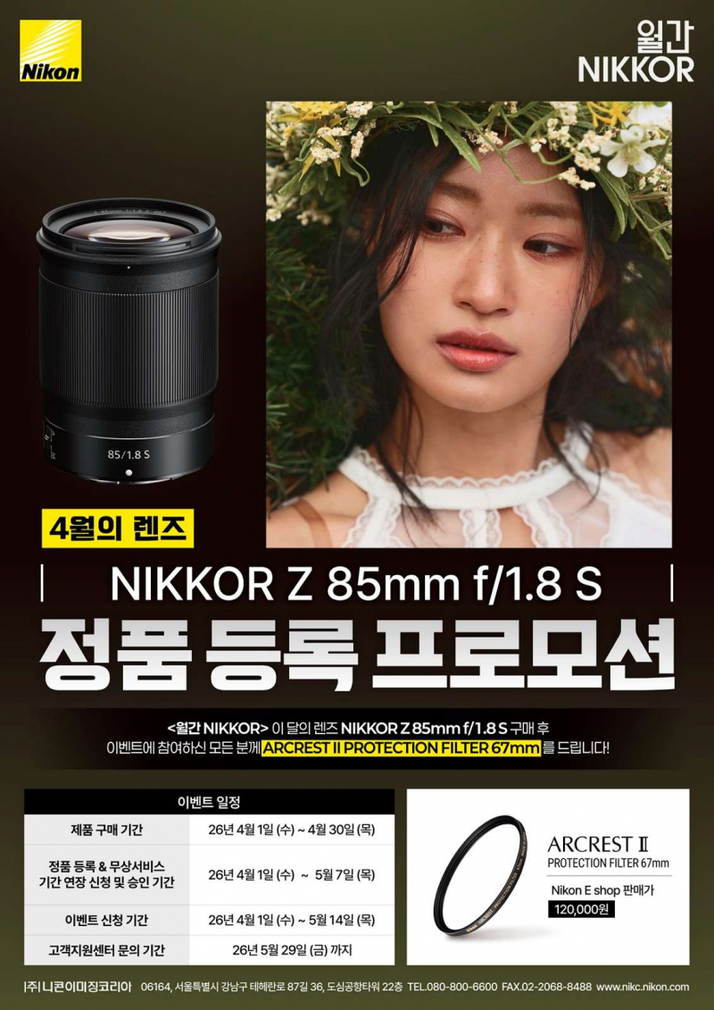 Nikon Imaging Korea announced that the April lens for its “Monthly NIKKOR” campaign is the NIKKOR Z 85mm f/1.8 S, and is offering a premium protection filter to customers who purchase and register the lens during the promotion period.