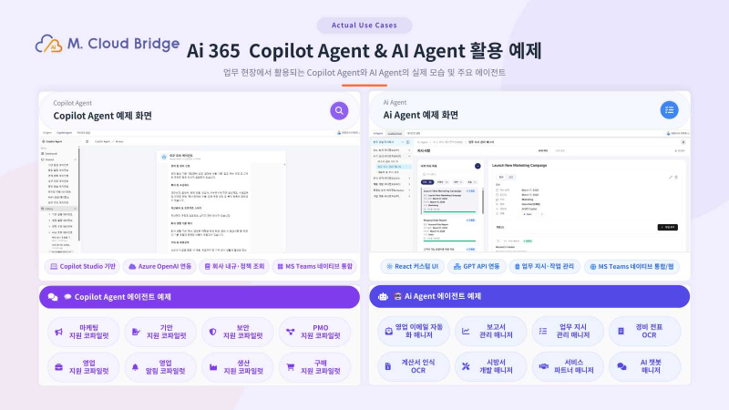 엠클라우드브리지는 Azure OpenAI, Google Gemini, Microsoft Fabric, Databricks 등 멀티 클라우드·데이터·AI 기술을 기반으로 Ai 365 Orchestration Platform을 고도화해 왔다고 설명했다. 이 플랫폼은 지식 에이전트, 데이터 에이전트, 업무 에이전트, 보안 에이전트 등을 하나의 환경에서 구성·운영할 수 있도록 설계됐으며, Microsoft 365 Copilot, Copilot Studio, Power Automate, Azure OpenAI와 연계해 코파일럿 에이전트와 AI 에이전트를 함께 운용할 수 있도록 구성됐다.
