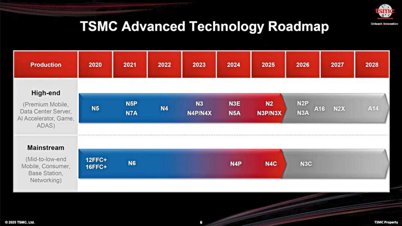 차세대 A14 공정도 구체적인 성능 목표가 제시됐다. TSMC는 A14에 2세대 나노시트 트랜지스터 구조를 적용해 N2 대비 동일 전력 기준 10~15% 성능 향상, 동일 성능 기준 25~30% 전력 절감, 약 20% 칩 밀도 개선을 기대하고 있다고 밝혔다. 양산 시점은 2028년으로 제시됐다. 이는 차세대 AI와 고성능 컴퓨팅 수요를 염두에 둔 장기 로드맵의 일환이다.