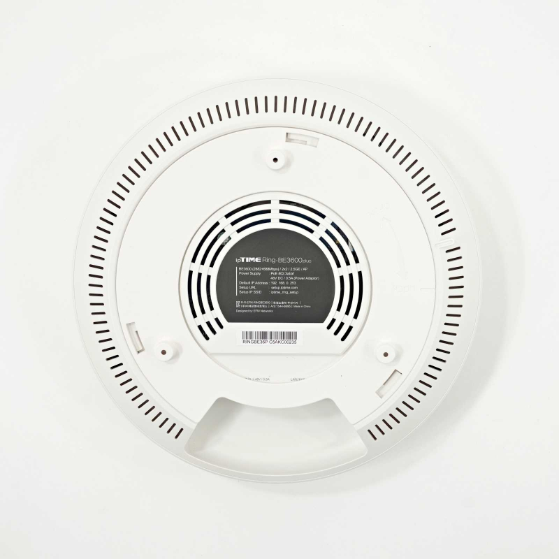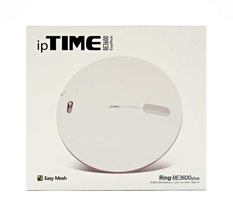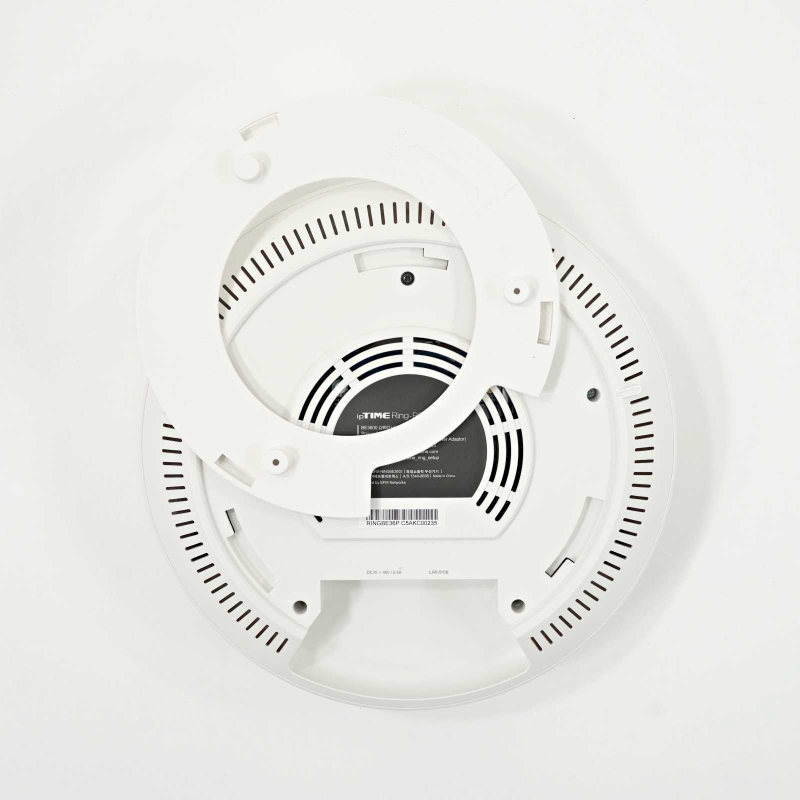 아이피타임 Ring-BE3600 plus의 첫인상은 단연 독특한 외형에서 시작한다. 일반적인 공유기나 확장기가 직사각형 박스 형태에 외장 안테나를 달고 있는 것과 달리, 지름 250mm, 두께 67mm의 납작한 원반 형태를 띠고 있다. 무게는 612g으로 손에 들면 묵직한 편이지만, 벽이나 천장에 고정하면 그 무게감은 체감하기 어렵다.