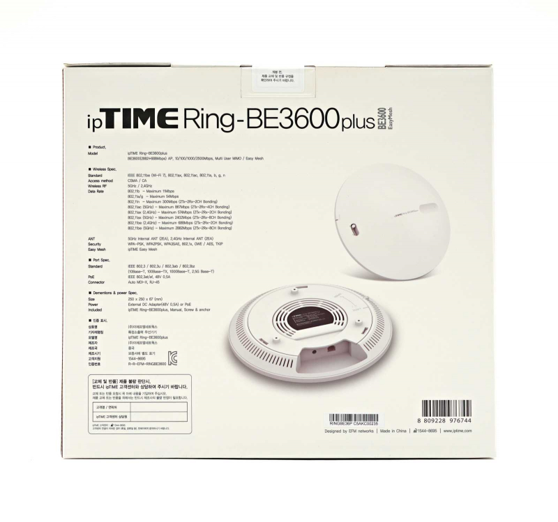 그것의 정체는 바로 천장 부착형 무선 AP(액세스 포인트)다. 가정용 공유기처럼 책상 위에 올려두는 제품이 아니라, 공간 곳곳에 설치해 넓은 면적 전체에 고르게 무선 신호를 공급하는 상업용 혹은 고성능 확장형 장비다. 이번에 소개하는 제품은 네트워크 장비 시장에서 탄탄한 입지를 다져온 EFM네트웍스의 브랜드 아이피타임(ipTIME)이 내놓은 Ring-BE3600 plus다.