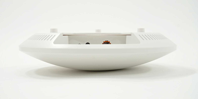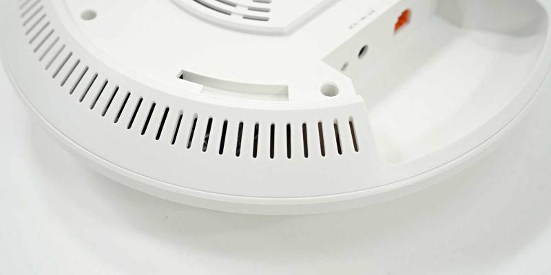 전면(상단)은 깔끔하게 마감된 흰색 플라스틱으로, 아이피타임 로고와 상태 표시 LED가 음각 처리되어 있다. LED는 현재 제품의 동작 상태를 알려주는데, 전반적으로 튀지 않는 발광 방식 덕분에 설치 후에도 공간 분위기를 해치지 않는다. 후면(하단)에는 방열을 위한 타공 패턴이 미려하게 배치되어 있어, 기능과 디자인을 동시에 고려한 설계임을 알 수 있다.
